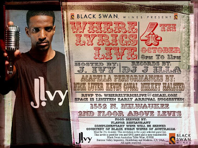 Also, J. Ivy is having a must attend live event Saturday October 4th at 1552 N. Milwaukee, 2nd Floor (the same spot as the event I had with Mikkey). The event will also feature live spoken word performances from Kevin Coval, Mikkey Halsted and Mick Luter. Also, the folks in attendance will be treated to the sounds of Jay iLLa on the 1’s and 2’s. Free wine courtesy of Black Swan.